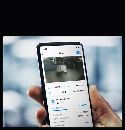 Once K1 Max is connected via WiFi or RJ45 Ethernet port to the LAN or Internet, you can monitor and control the printing from a PC or phone with Creality Print software or Creality Cloud. Even better, when many K1 Max printers are online, they can be easily clustered or grouped for volume production.