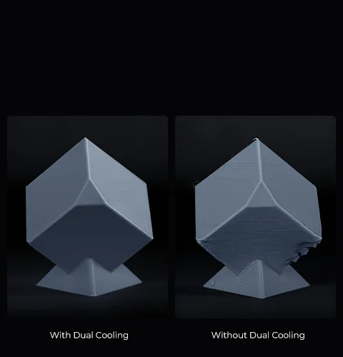 A large fan on the printhead with air ducts cools the model directly. An 18W auxiliary fan in the build chamber enhances the cooling effect, too.