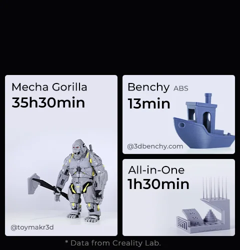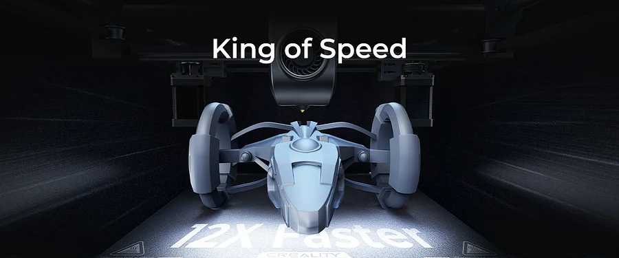 K1 Max reaches 600mm/s* in only 0.03s based on 20000mm/s² acceleration. It can be as productive as several 3D printers together. K1 Max: 600mm/s Regular 3D Printer: 50mm/s * The 600mm/s speed is achieved at Creality Lab in the Surface Mode with 0.1mm layer height. * The typical speed is 300mm/s. The travel speed is 800mm/s.