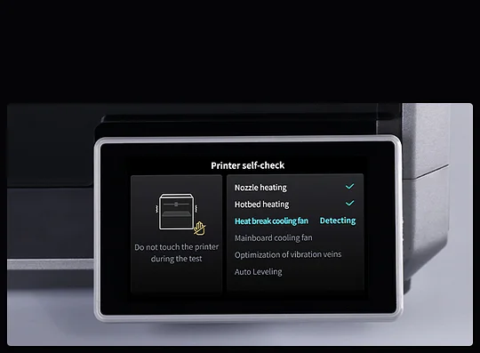 Give a tap, and K1 Max will self-test the extruder, heatbed, camera, fan, leveling, G-sensor, etc. Any abnormality will prompt on the display. So, users can proceed confidently without hitch.